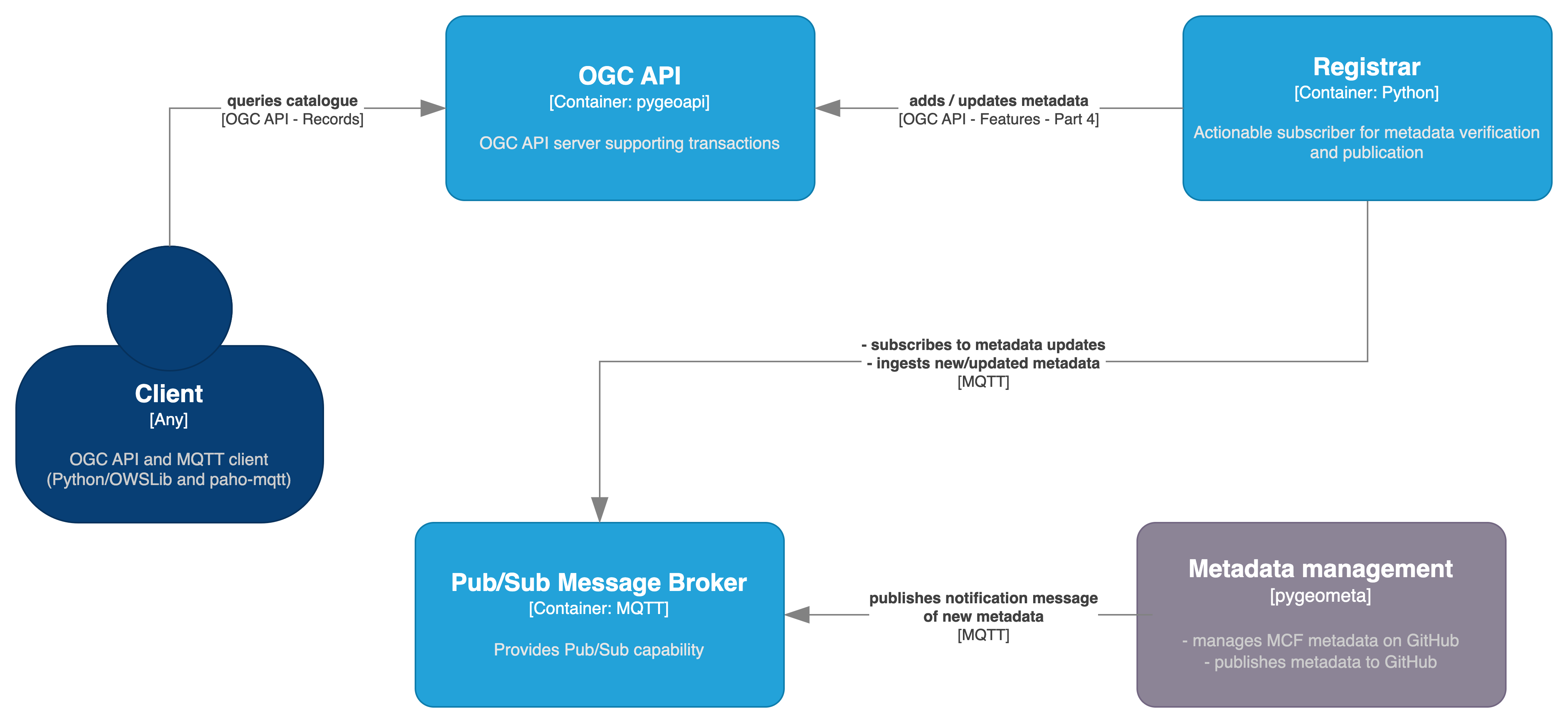 - From here, a metadata registrar is subscribed to the same MQTT broker and, on notification, verifies new/updated metadata and publishes to an OGC API - Records endpoint (powered by pygeoapi) using OGC API - Features - Part 4. The QGIS desktop application is then used to query the OGC API - Records endpoint using its MetaSearch search client.